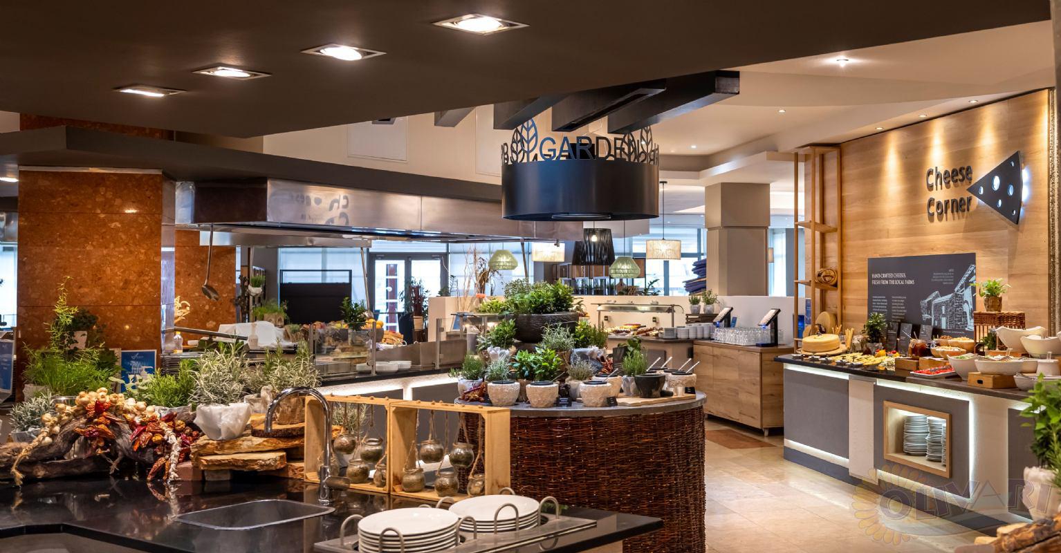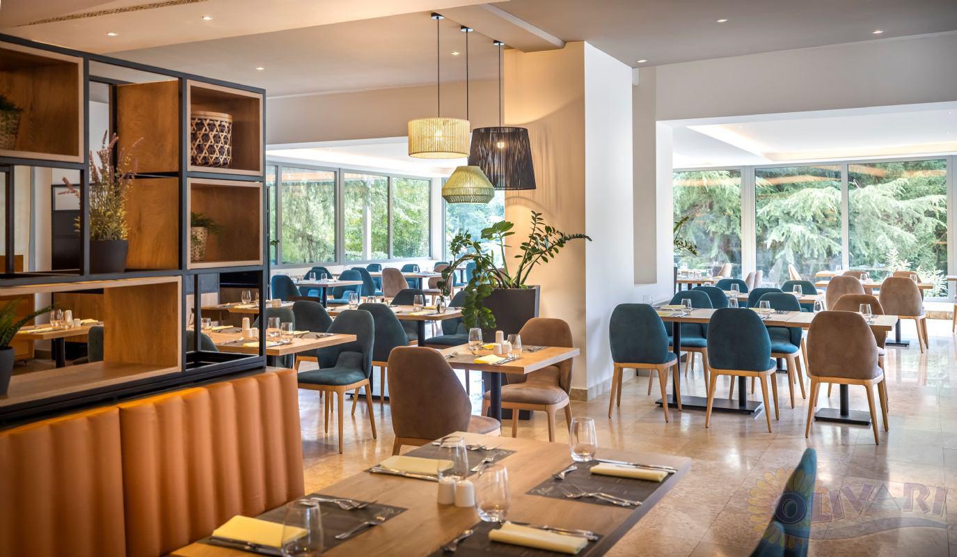 Mediterraneo Restaurant – Buffetfrühstück, Mittag- und Abendessen mit Show-Cooking; Themenabende zweimal wöchentlich (15. Juni – 15. August).New Oliva Grill – À-la-carte-Restaurant am Pool: gegrillte Gerichte, Pizza, Pasta, Salate, Cocktails.Vero Bar & Pool Snack Bar – Getränke, Cocktails, Snacks und leichte Erfrischungen.